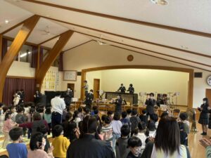 本日、はわいこども園にて依頼演奏をさせていただきました。園児たちと音楽を通して楽しい時間を過ごすことができました。また、リズム遊びや手遊び、ダンスなども一緒にすることができました。また演奏後のふれあい交流でも園児の皆さんと直接に関わらせていただく時間もあり、とても有意義な時間となりました。お世話になりましたこども園の先生方、園児の皆さん、今日は本当にありとうございました♬