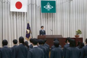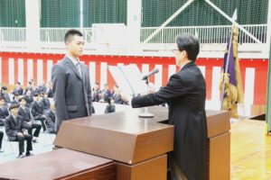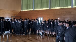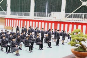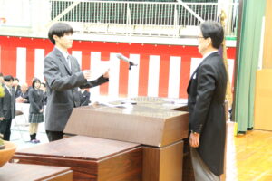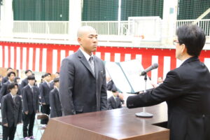 河本校長の式辞では、多くの部活動を含むたくさんの生徒が地域に尽くし、人の役に立つことを選び続けた姿を心から誇りに思うこと、3年生が主導となって導いた北高祭・運動会・球技大会・ハロウィンウォークなどの行事で全校生徒が一つになって創り上げる姿を見せてくれたこと、爽やかで力強く相手の心を明るくする挨拶をし続けてくれたこと、皆さんが本校で培ってきた誠実さ、思いやり、そして挑戦する心はどのような社会にあっても未来を切り拓く確かな力になると信じていることなど述べられました。