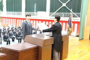 卒業生代表として答辞を読んだ森木翔さん(総合コース:サッカー部:鴨川中学校)は、3年間の学校生活で仲間と過ごした日々やサッカー部で個人としてもチームとしても仲間と共に覚悟を持って取り組んできたこと、支えてくれた先生方や保護者への感謝、後輩へのメッセージ、そして両親への感謝のことばなど、一つひとつ噛みしめる様に話をしてくれ会場には感動が広がりました。