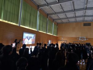 卒業式後、3年生は会場を第2体育館に移動して、3年間を振り返った動画と学校祭で歌ったキセキ(Greeeen)を歌いあいました。卒業生自ら発案した企画でもあり、肩を組んで笑顔や涙で熱唱する姿は素敵な光景でした。